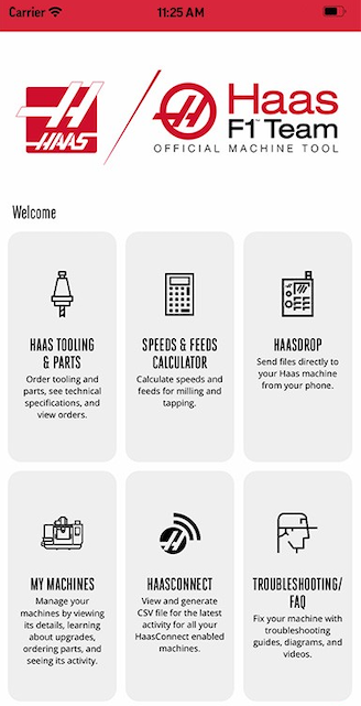 Como parte de la aplicación MyHaas, HaasConnect permite monitorizar las máquinas incluso cuando usted no se encuentra en el taller. Monitorización del estado de las máquinas o anulaciones de avance y de husillo, entre otros. HaasConnect se suministra de serie en todos los controles de nueva generación.