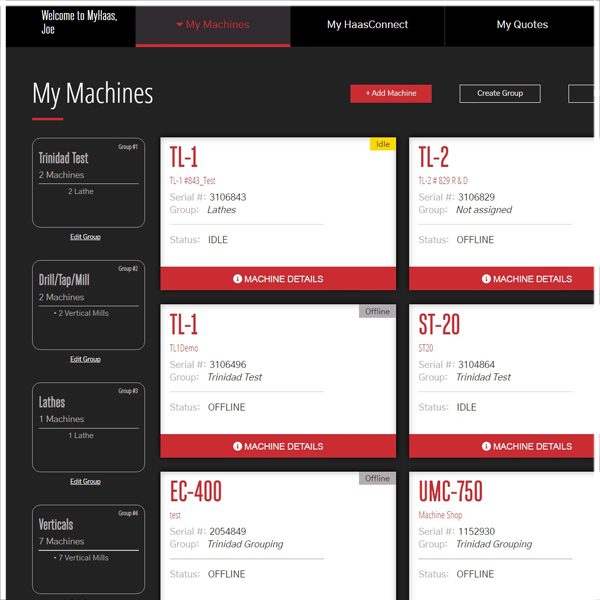 Personalice su panel de control para gestionar y agrupar todas las máquinas Haas de su flota (tanto NGC como clásicas).
