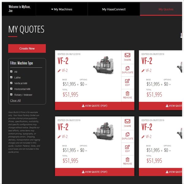 ¿Ha terminado de configurar el presupuesto para una máquina, pero no está listo para comprar todavía? Está bien… solo guarde su compilación en su cuenta MyHaas y vuelva a ella más tarde. Duplique el presupuesto, realice cambios, compártalo con un compañero: todo está al alcance de su mano. ¿Ya eres propietario de una máquina Haas? Agregue sus máquinas para monitorizar la actividad y administrar su flota. Realice pedidos de piezas directamente de HaasCNC.com.
