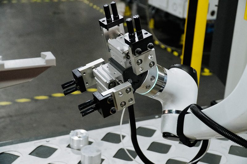 The dual grippers* allow the cobot to pick up raw stock with one gripper and offload a finished part with the other, decreasing machine idle time. Having the cobot complete the process while the machine is running increases productivity and reduces overall cycle time.