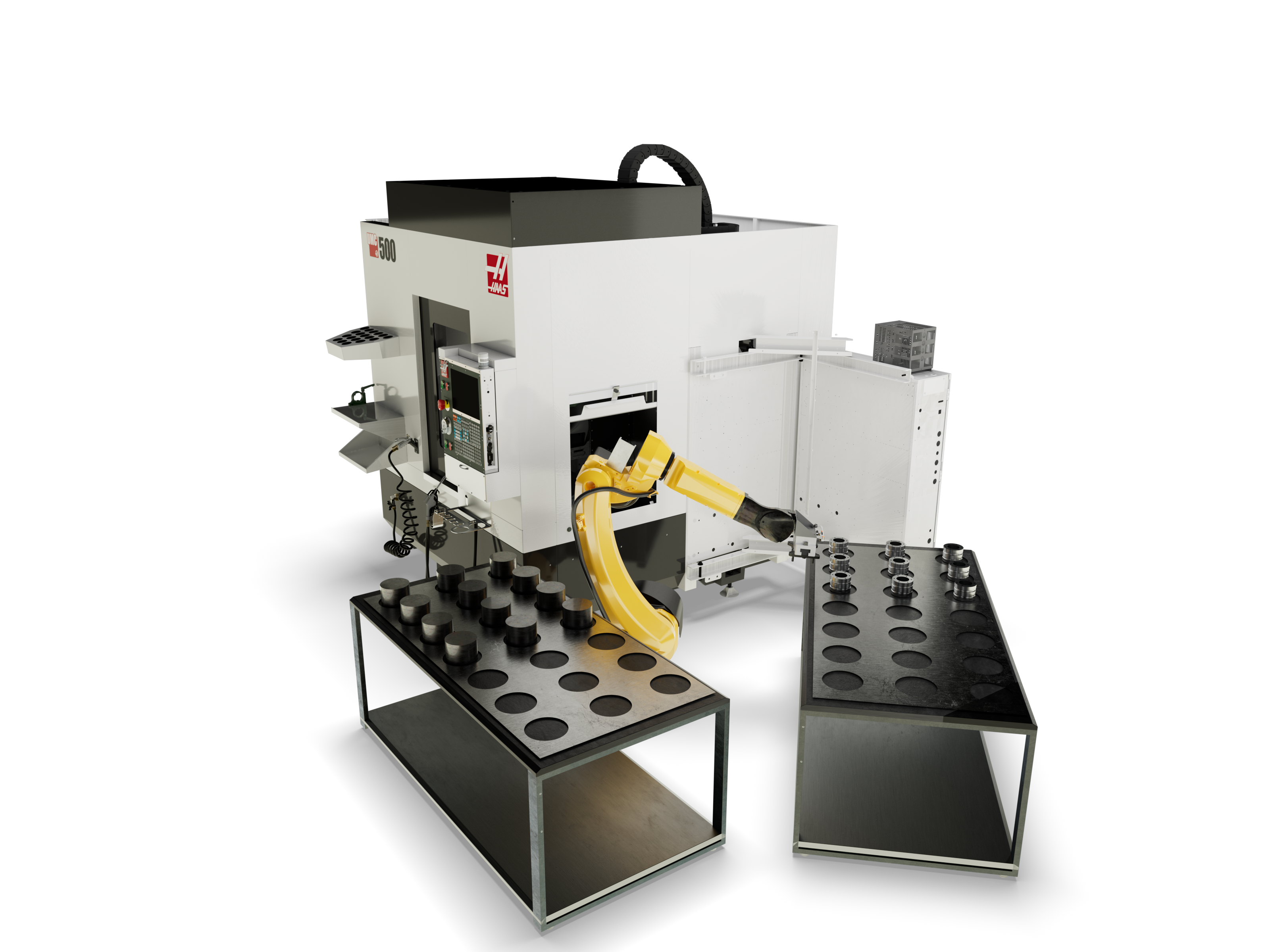 Robots and cobots offer the greatest degree of flexibility in an automation system. You can have different pick-up and drop-off locations, and you can incorporate a part-flipping station to combine multiple operations. Both platforms interface directly through the Haas control, eliminating the need for a third-party integrator, which means the overall package is less complex, less expensive, and more predictable in behavior.