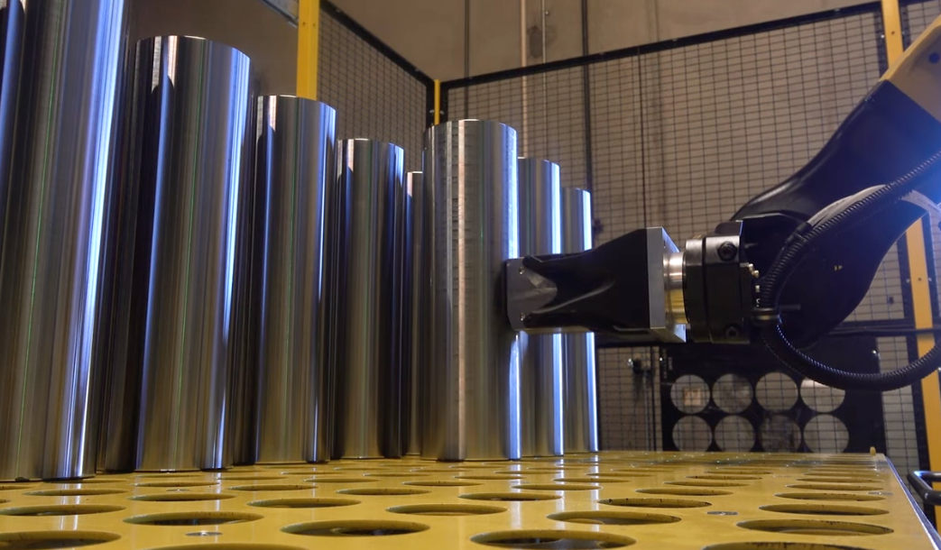 This Haas 25 kg Robot Package at Western Saw in Oxnard, CA, uses a unique magnetic gripper to load and unload parts from a Haas ST-30. Watch as the 25 kg robot easily handles these large, steel cylindrical parts.