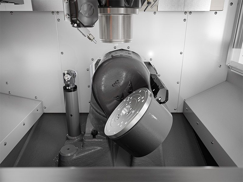 In 5-axis machining, your part and workholding must be able to rotate and tilt within the workspace, allowing you to reach all areas of the part, without interference or collisions. This yields a cylindrical work envelope that is smaller than the machine travels.