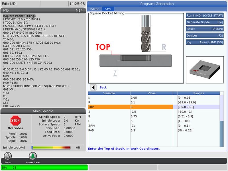 VPS is gepatenteerde dialoogprogrammeringssysteem van Haas Automation dat eenvoudige, stap-voor-stap sjablonen en 3D graphics gebruikt om de gebruiker te helpen snel programma’s te creëren voor eenvoudige machinebewerkingen. Er is geen kennis van G-code of CAM-software vereist.