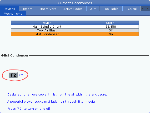 Manually turn the Mist Condenser on or off by pressing the [CURRENT COMMANDS] button and navigating to DEVICES > MECHANISMS > MIST CONDENSER. Press [F2] to turn on the Mist Condenser. Press [F2] again to turn it off.