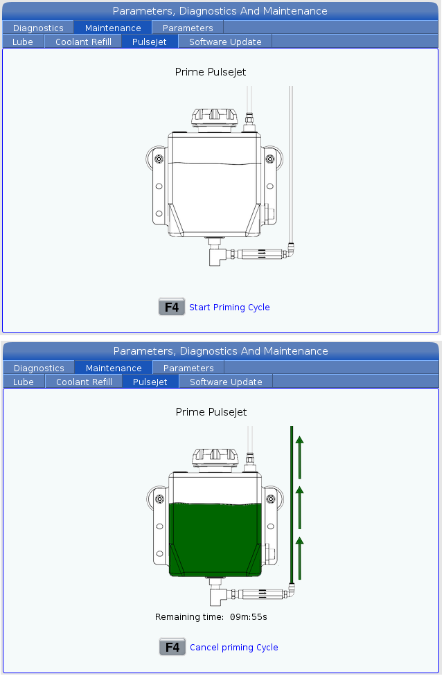 • Press [F4] to begin the priming cycle. The PulseJet will now pulse for 10 minutes. A countdown timer is shown on the screen.