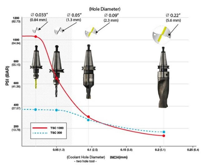 • Larger coolant passages in the tool allow more fluid to pass through, resulting in lower pressure at the cutting edge