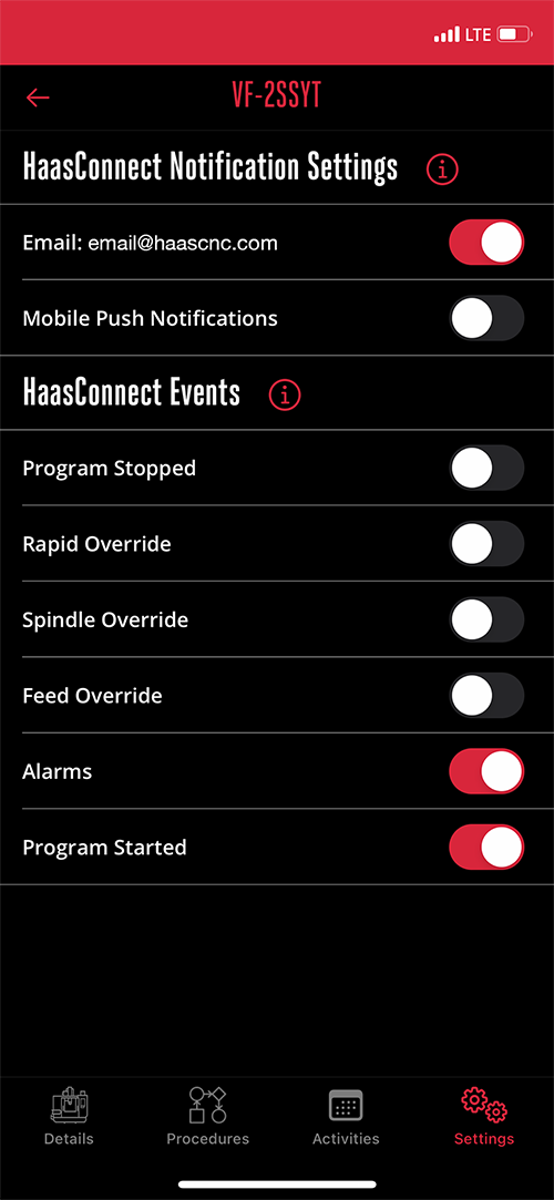 Every Haas machine comes equipped with HaasConnect, a remote machine monitoring system that provides instant alerts for machine status via email and the MyHaas mobile app. The Haas Control has the ability to send you, and others you designate, notifications about the operating status of your Haas machine. Set up is simple and easy through the MyHaas Portal at HaasCNC.com or through the MyHaas app.