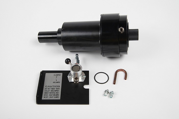 The AC-100 uses spring force for part clamping, and air pressure for release. It will retain full part clamping even if air pressure is removed. The AC-100 provides a 1.06" (27 mm) diameter through-hole, and collets are easily tightened from the rear. It provides up to 10,000 lb (44,482 N) of draw force, with 0.025" (0.64 mm) travel, and can be used for drilling and milling in most applications. The 0.025" (0.64 mm) travel allows for a part diameter variation of 0.006" (0.15 mm) without the need to readjust the collet. Due to its long rearward length, the AC-100 cannot be used vertically, and is not recommended for tilting HA5Cs. Also, some consideration must be given to clearances when using the AC-100 parallel to the Y axis, as its length may collide with the Z-axis way cover. Includes one closer for each head on multi-head units.