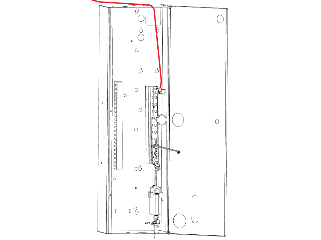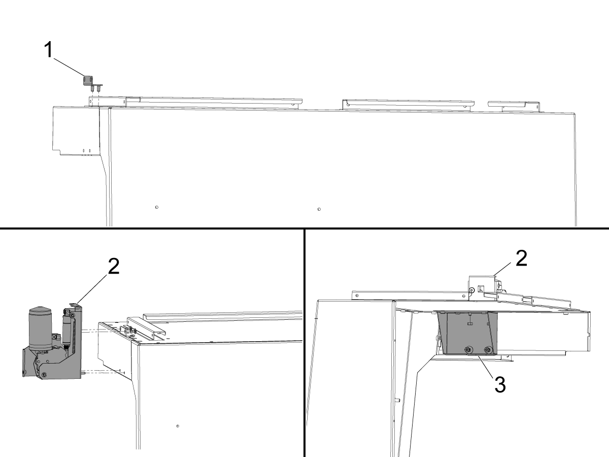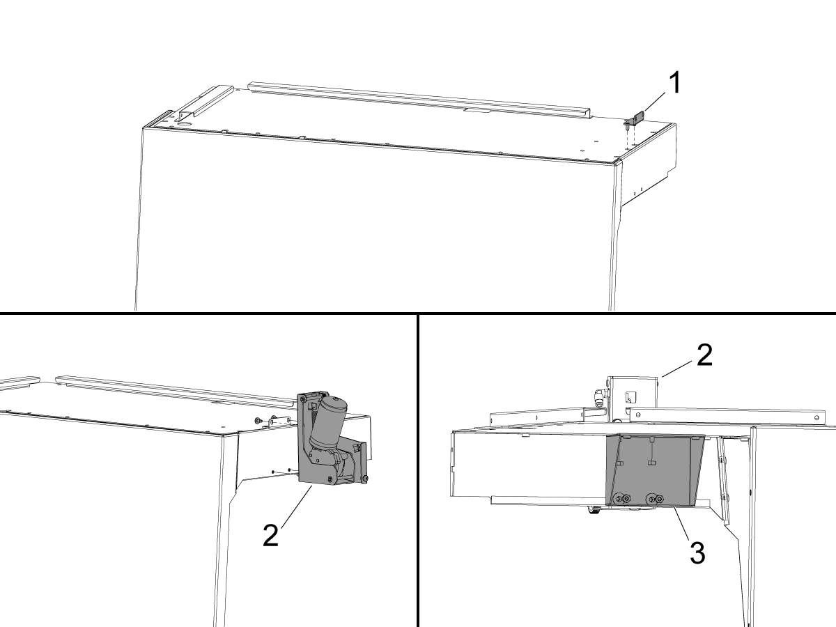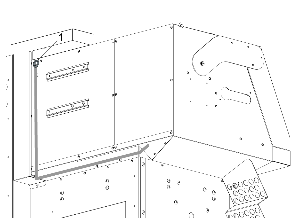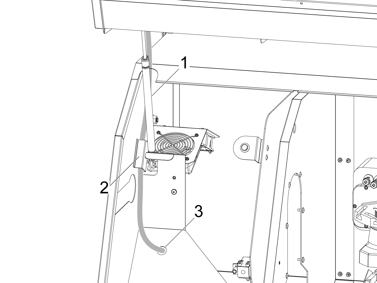 Cover the wires with the provided spiral wire wrap and attach them to the door strut [1] and run them through the side bracket [2] and finally through the enclosure hole [3] to the back of the machine.