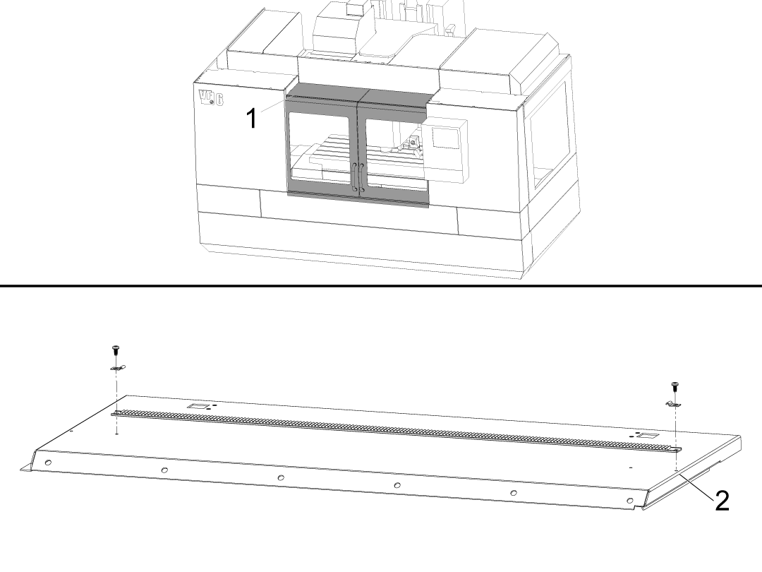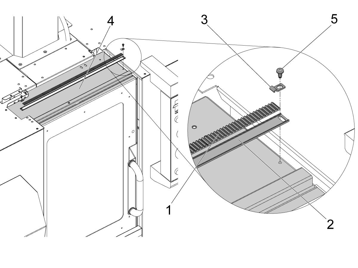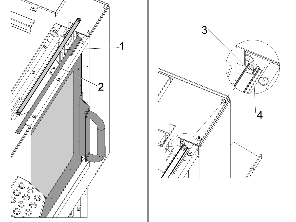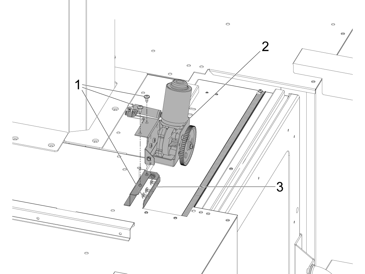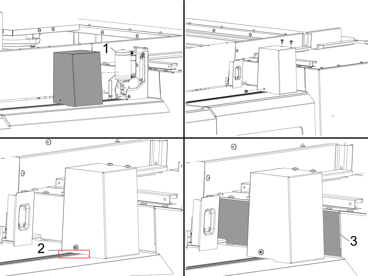 Cover the wires with the provided spiral wire wrap and attach them to the door strut [1] and run them through the side bracket [2] and finally through the enclosure hole [3] to the back of the machine.