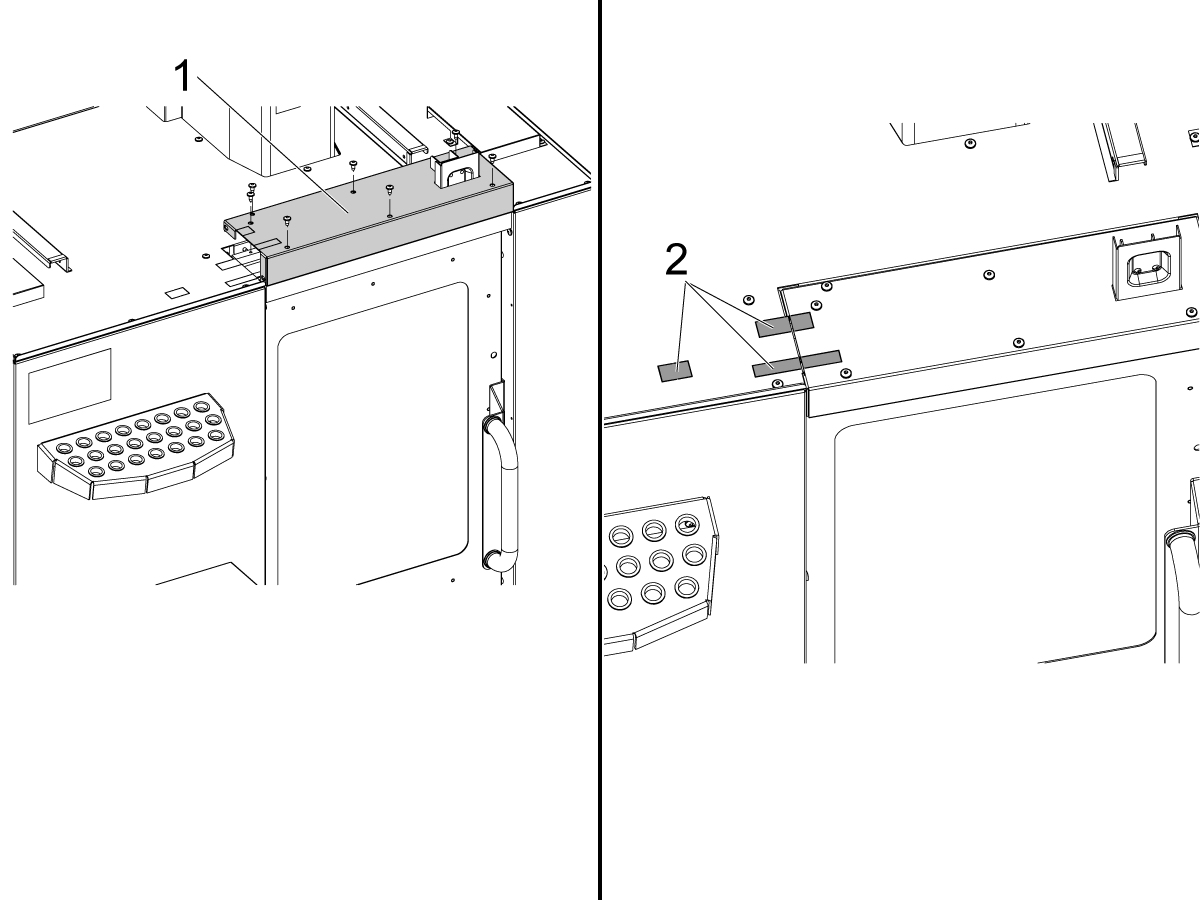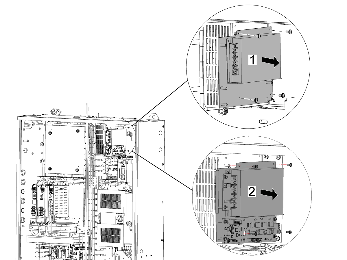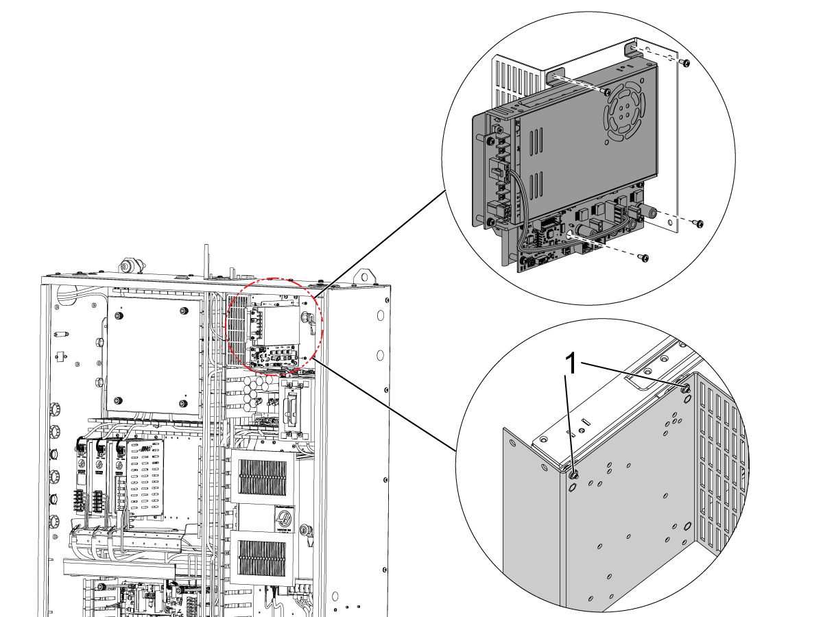 • For machines built after July 2021, the LVPS should have (2) pem nuts [1] on the existing through holes on the top of the LVPS and the 6-32 nuts are not needed to install the 350W CAN Autodoor Power Supply.