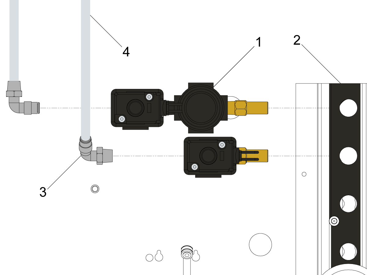 Connect the air solenoids [1] into the top of the manifold [2] and connect the air lines [4] into the fittings [3].