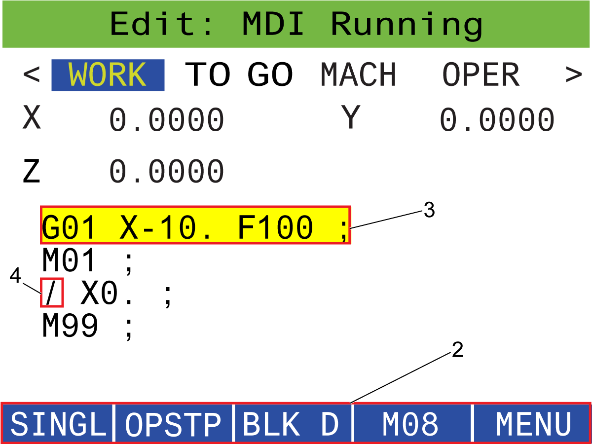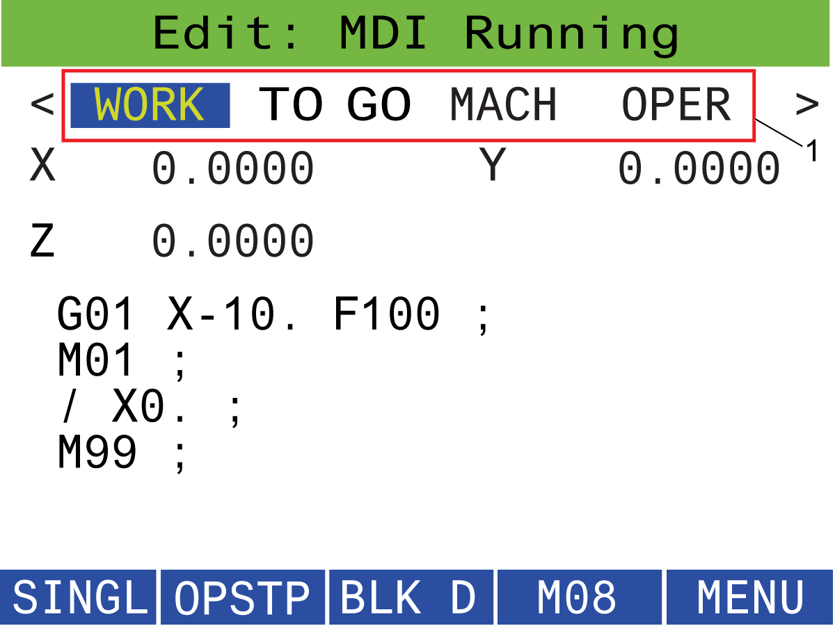 When M08 is pressed, the coolant turns on and the button will then read M09 which will turn the coolant off when pressed.