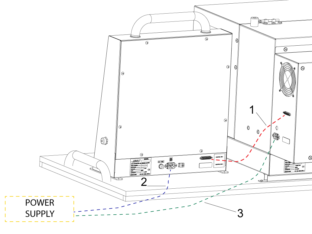 Once the desktop lathe is completely assembled plug in the DB25 cable to the port shown [1]  and connect both cables [2] and [3] to power.