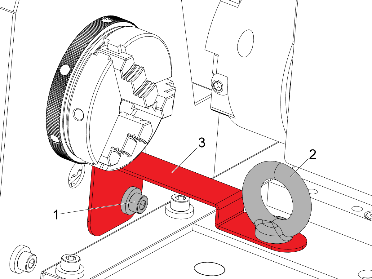 Unscrew the screw with a 4 mm Allen wrench and remove the washer [1] from the spindle head, then unscrew the eye bolt [2] from the saddle to remove the shipping bracket [3].