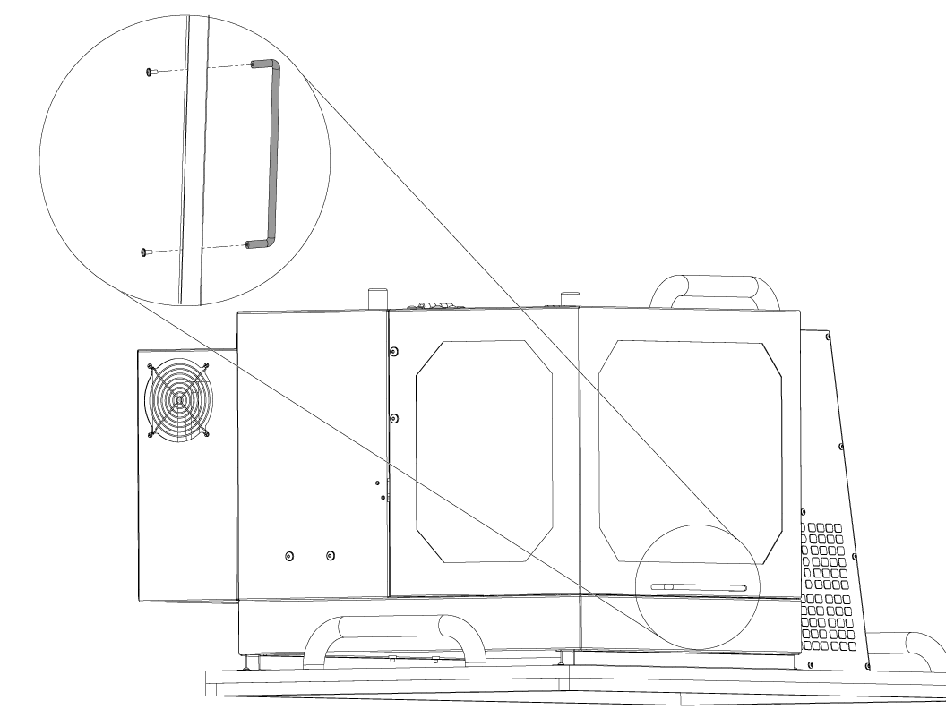 Open the door and attach the door handle by screwing the #8 bolts into the handle as shown.