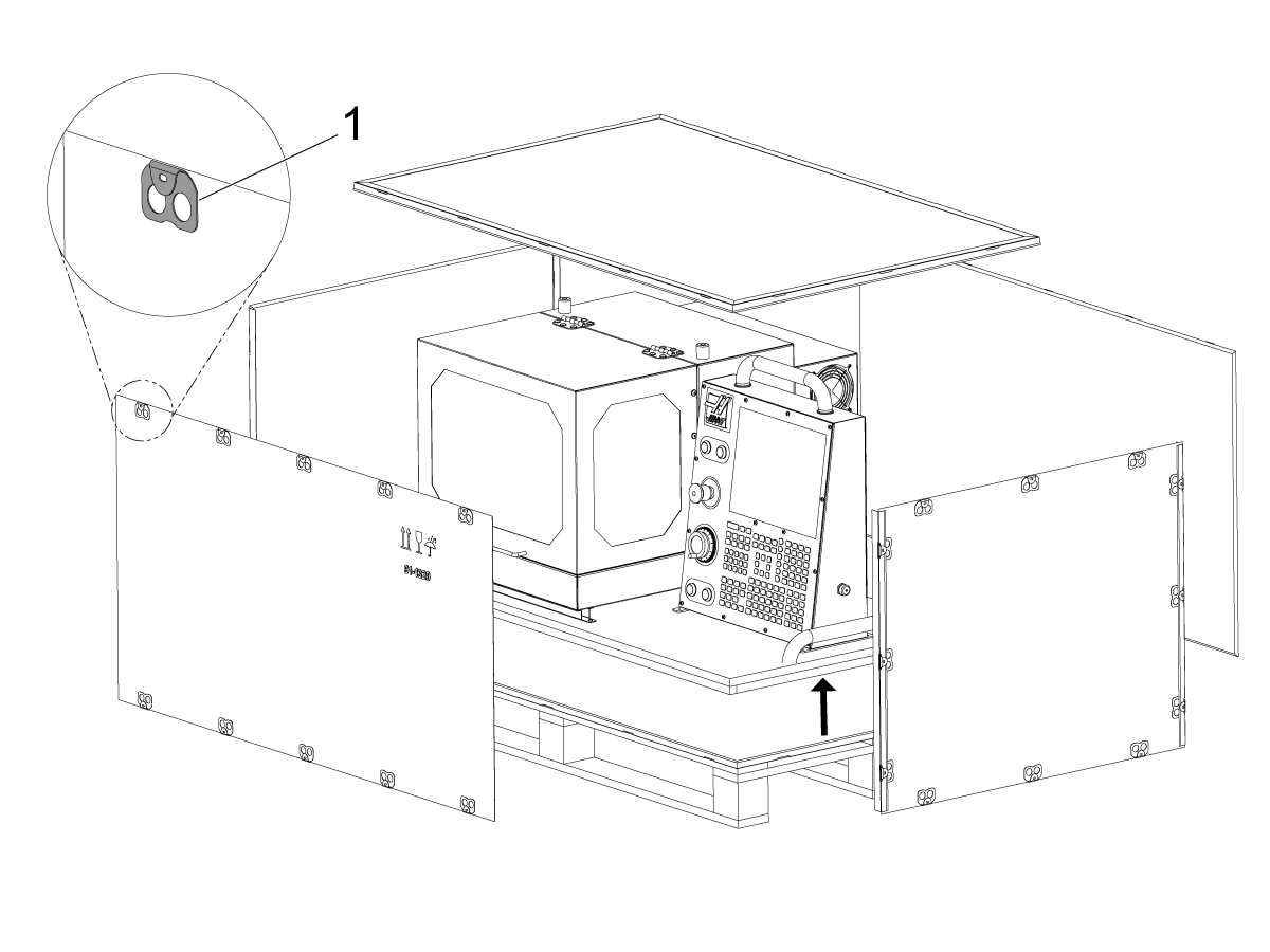 When unpacking, bend the tab [1] so it is no longer bent back on itself, and the crate can be disassembled as shown.