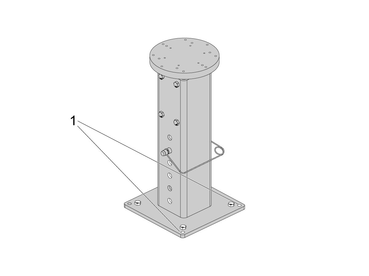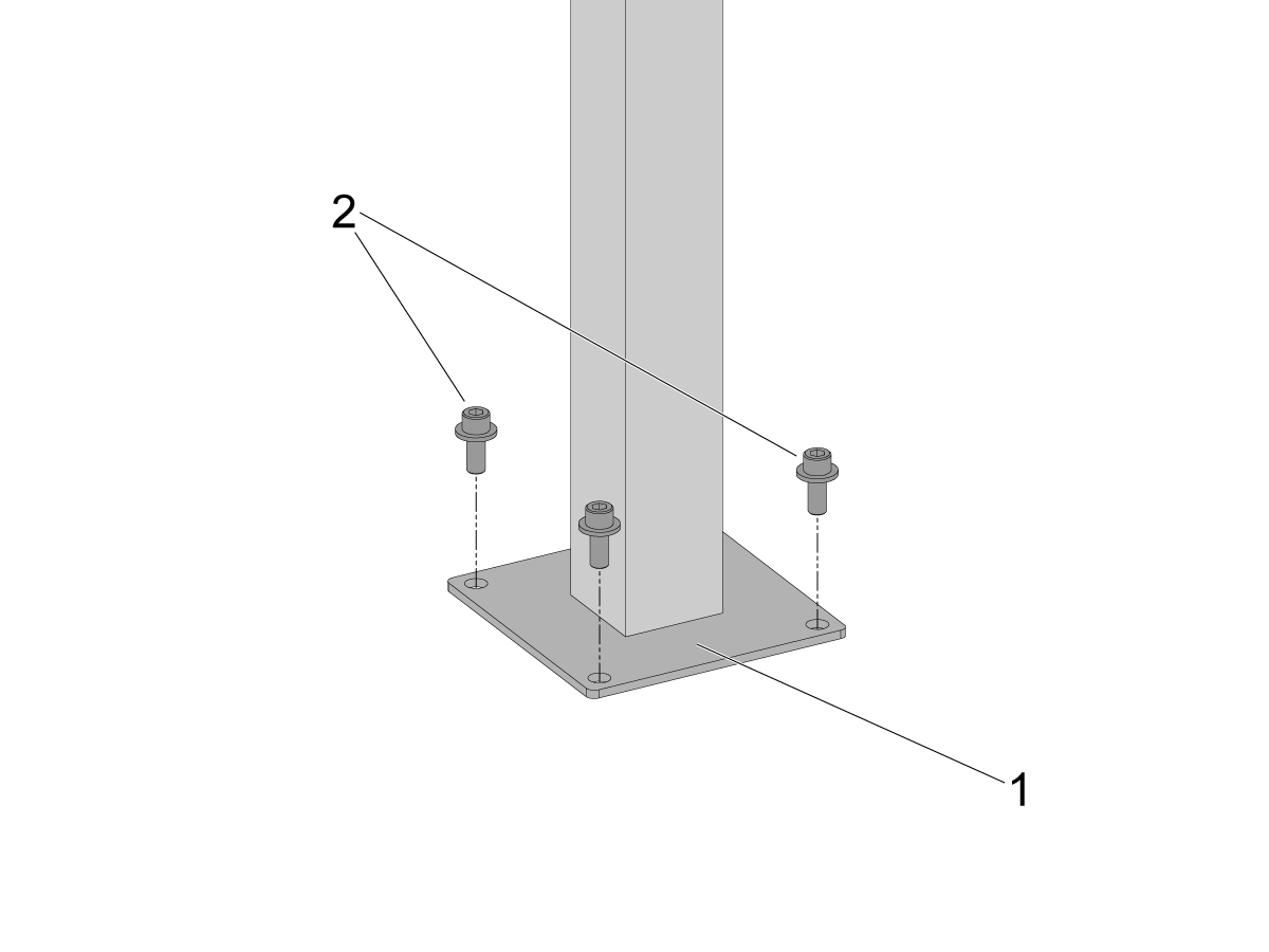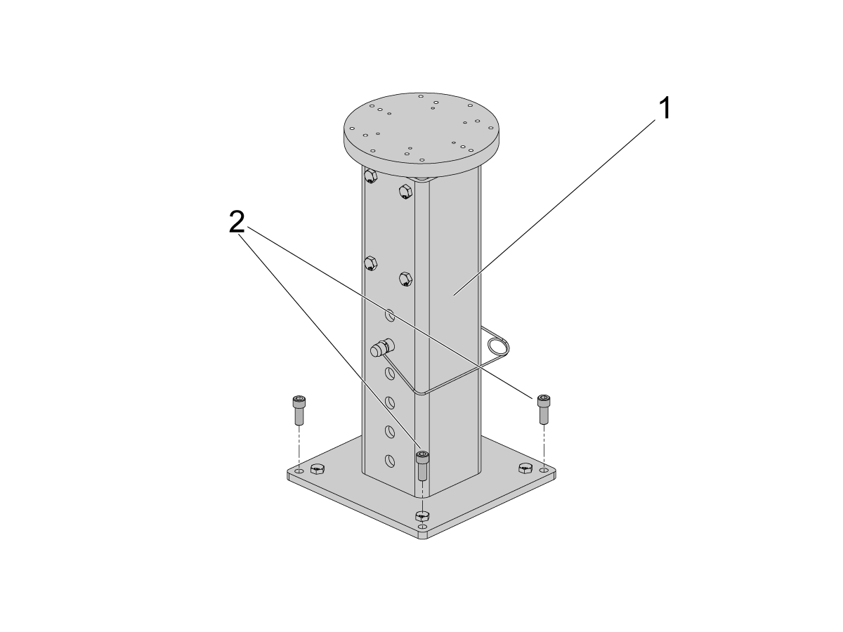 After the anchors are installed, fasten the stand [1] to the foundation using the 4 1/2" x 1 1/4" SHCS and washers [2].