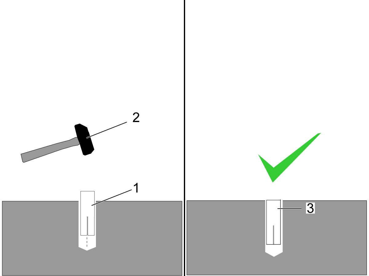 Use a hammer [2] to make sure that the anchors are flush with the foundation as shown in image [3].