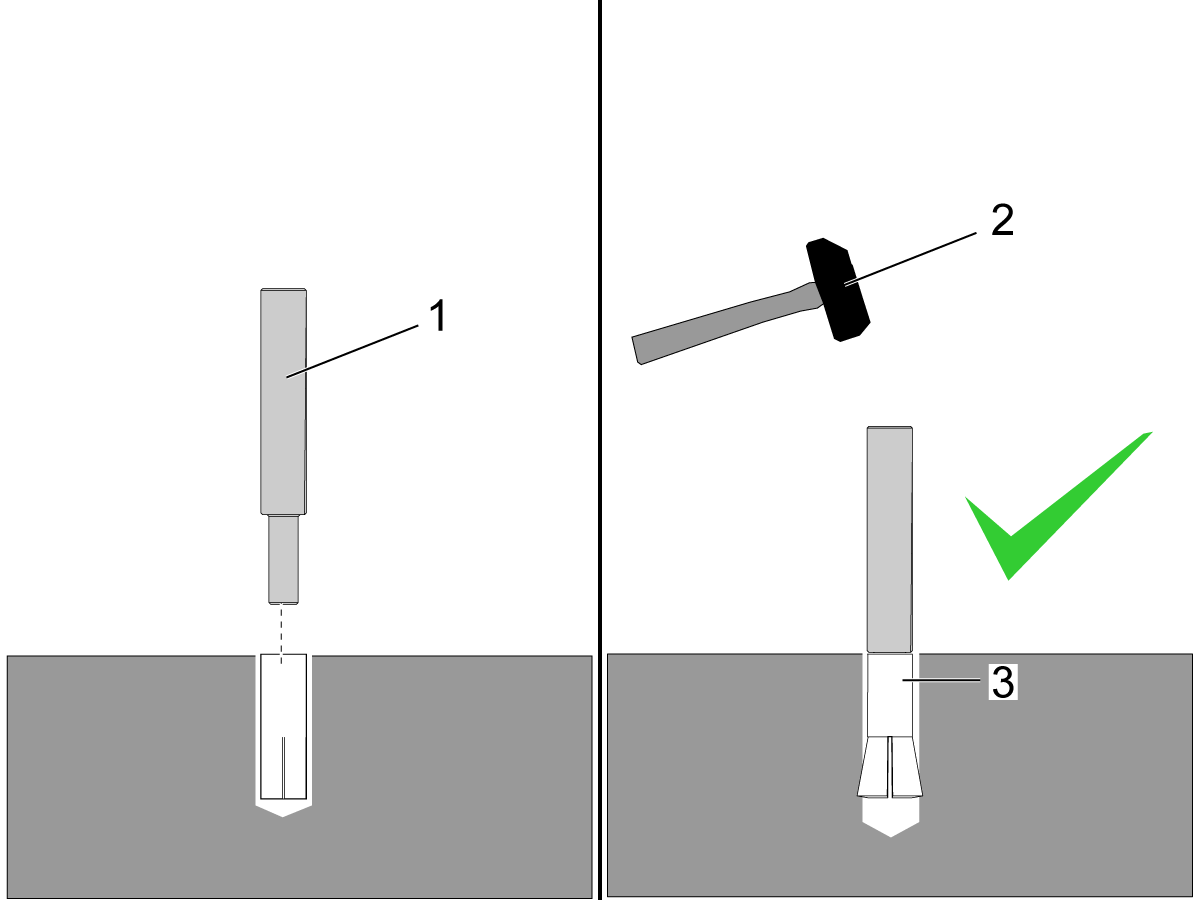 Use the setting tool [1] and hammer [2] to seat each anchor in the concrete.