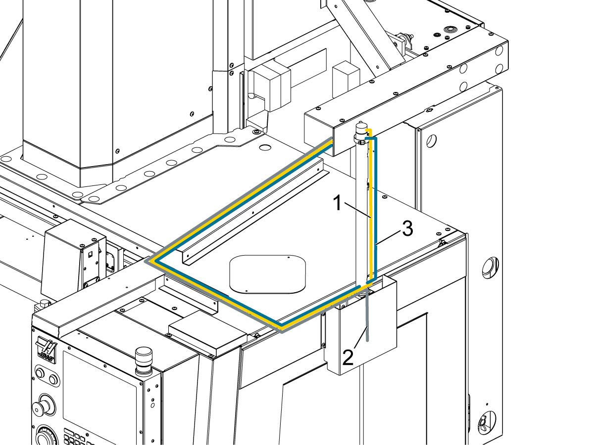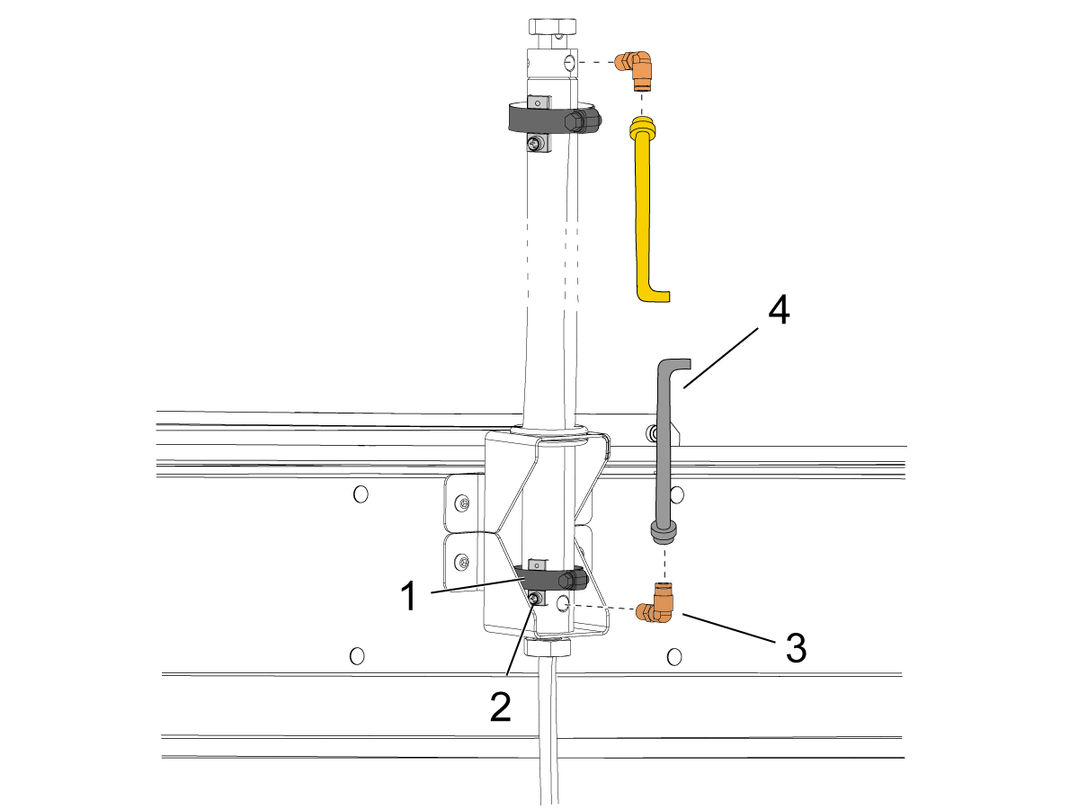 Route the gray airline [2] and sensor cable [3] up the piston rod until all wires meet.