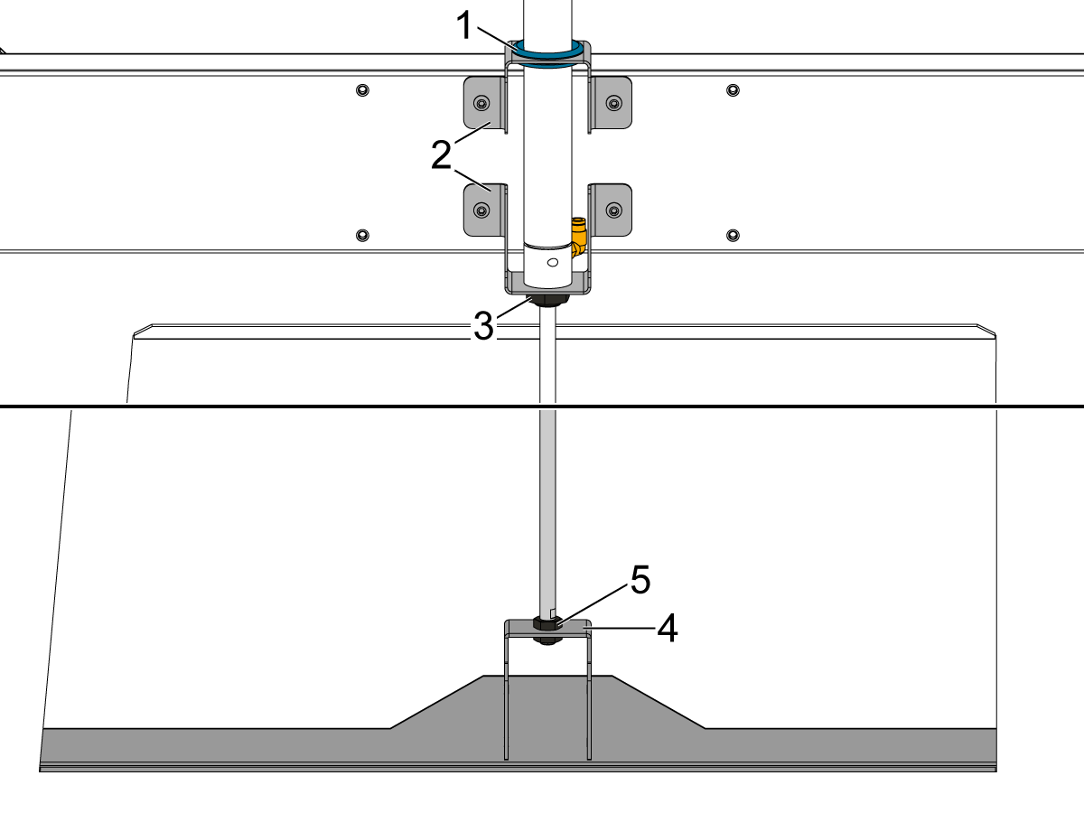 Remove bottom nut [3] on the piston rod to slide it through both brackets [2]. Replace bottom nut [3].