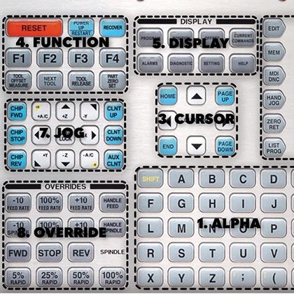 Огляд всієї клавіатури та розкладки екрана керування. Висвітлює певні ключові моменти для ознайомлення нового оператора, наприклад, як-от: Початок циклу, утримання подачі, скидання, E-Stop, вмикання/вимикання охолоджувальної рідини та екран довідки.
