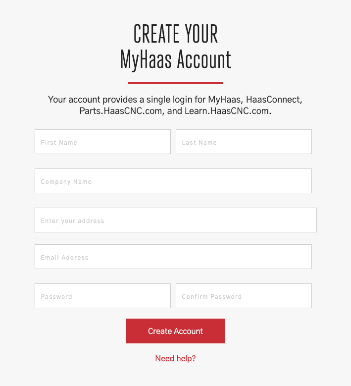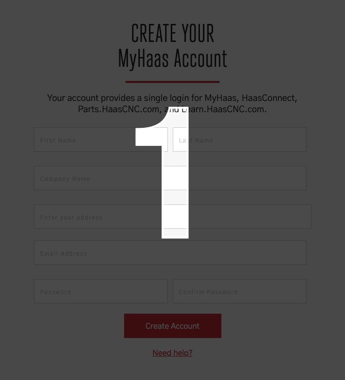 Створіть безплатний обліковий запис MyHaas. Цей обліковий запис надає єдиний вхід до Програми сертифікації з ЧПУ Haas на вебсайті Learn.HaasCNC.com, а також до MyHaas, HaasConnect та Parts.HaasCNC.com.