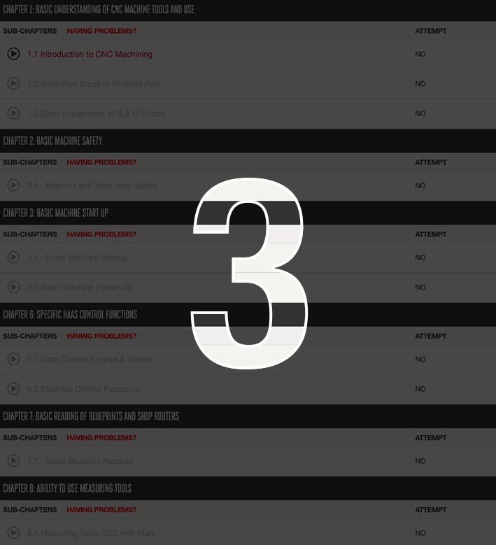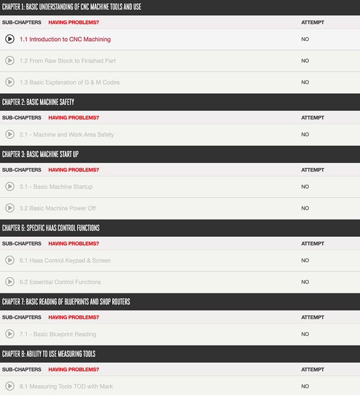 Після завершення онлайн-курсу студенти можуть запланувати особистий іспит у місцевій ЗТТ Haas, де їх попросять продемонструвати деякі з концепцій, представлених у відеороликах. Студенти, які склали практичний іспит, отримають сертифікат, що підтверджує завершення програми сертифікації з ЧПУ Haas.